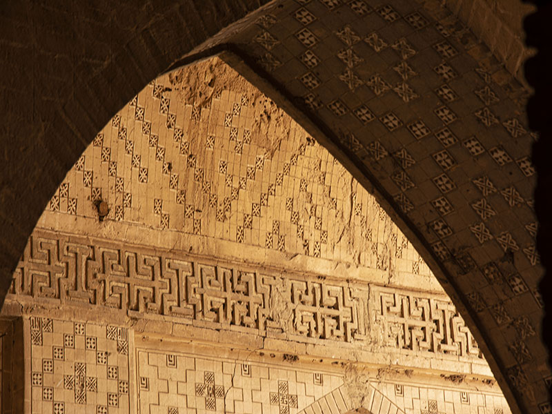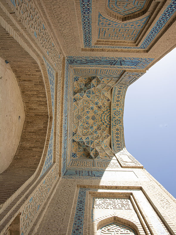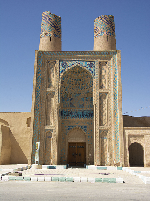 تزیینات روی مناره به صورت کتیبه مارپیج دیده می شود که ترتیب این تزیینات به این صورت است که در یک ردیف به رنگ فیروزخ ای و در ردیف دیگر به رنگ لاجوردی مگاشته شده است که تا انتها به این صورت ادامه دارد. طاق نماهای متعدد با قوس های جناغی که بر ستون های باریک توکار چندضلعی و یا دایره ای فرود آمده و در قاب های مستطیل شکل جای گرفته است. نقش عمده را در تقسیم بندی متقارن سطوح ایوان ایفا می کند.